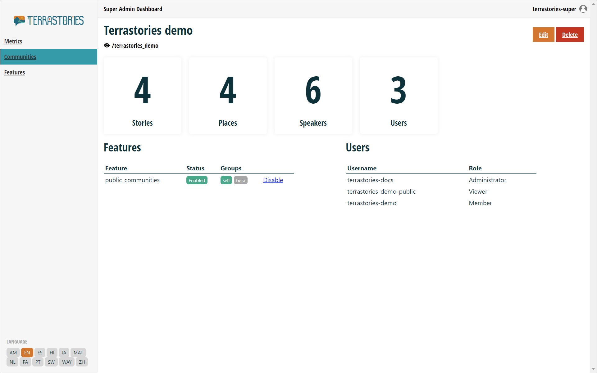 To administer communities on Terrastories, there is a special administrative user that has the power to create and modify communities. We call this **super admin**. When logged in as super admin, you are not able to access or modify any community's data or maps; this user can only create and edit basic details of communities, as well as access generalized usage and data metrics.